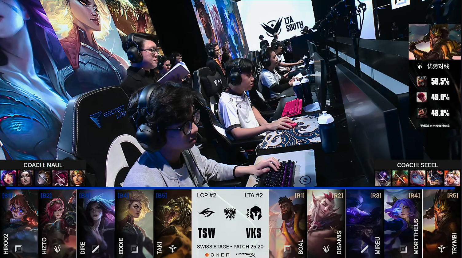 第一局比赛,TSW蓝色方,禁用:妮蔻、乐芙兰、发条、霞、希维尔,选用:Hiro02鳄鱼、Hizto蔚、Dire阿萝拉、Eddie卡莎、Taki芮尔;VKS红色方,禁用:琪亚娜、兰博、波比、泰坦、牛头,选用:Boal奎桑提、Disamis皇子、Mireu瑞兹、Morttheus芸阿娜、Trymbi洛